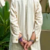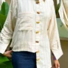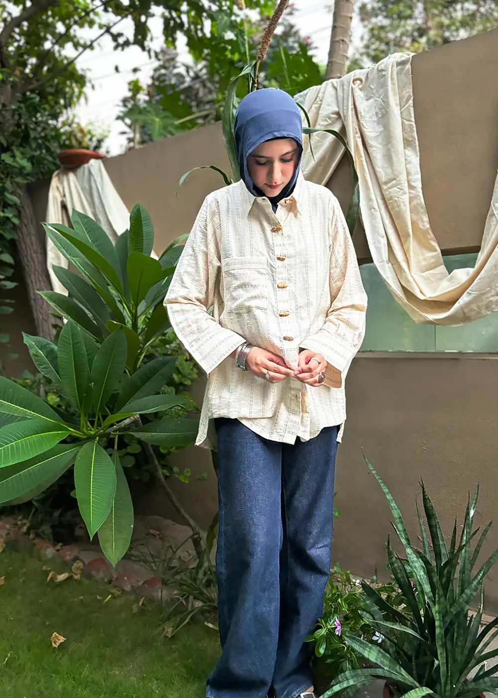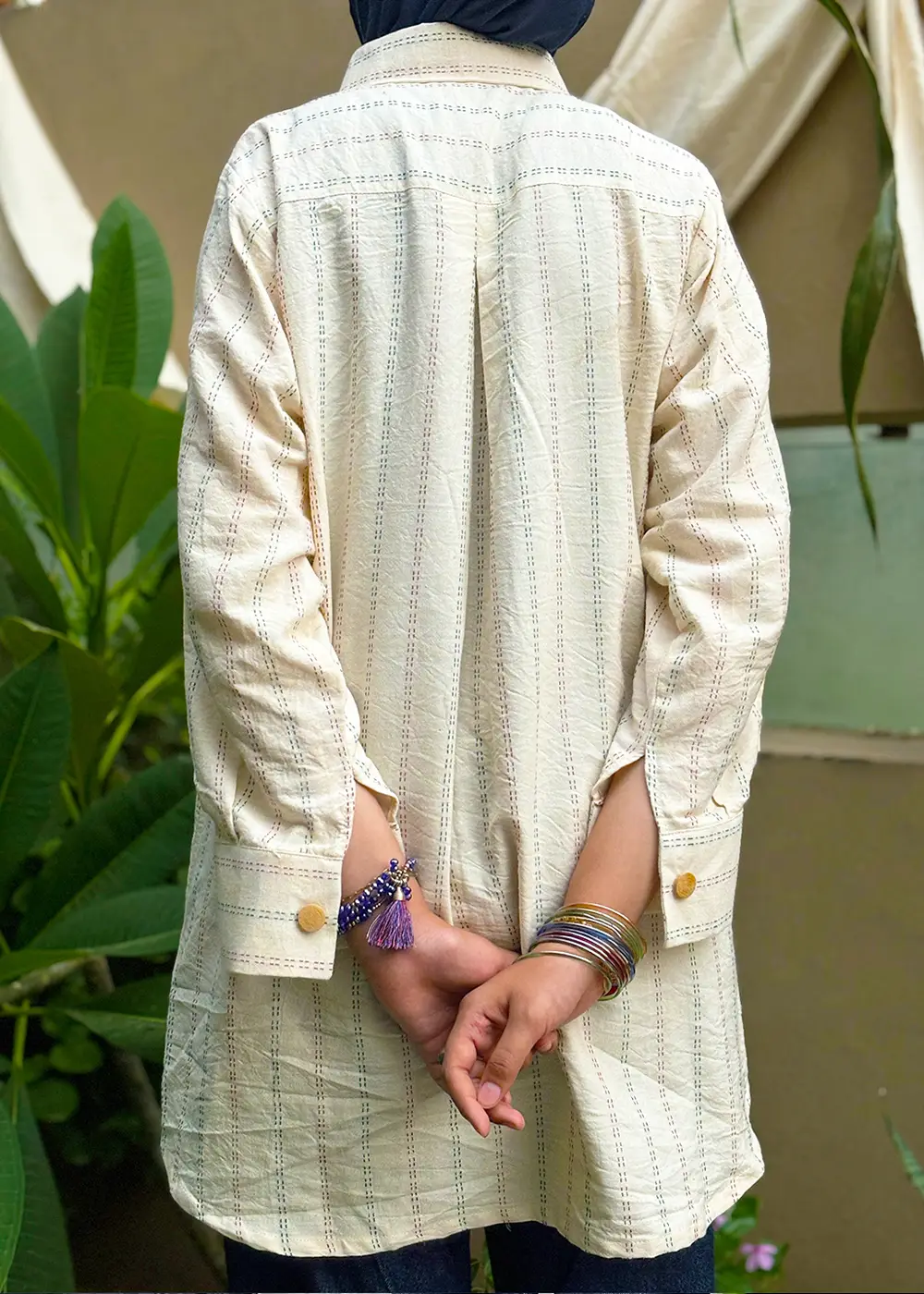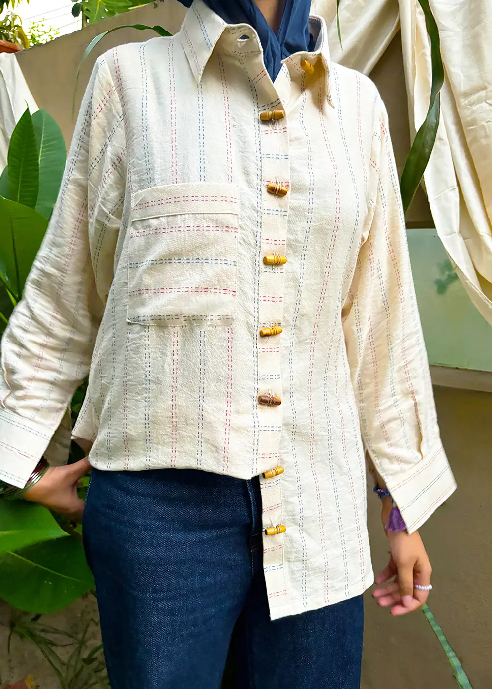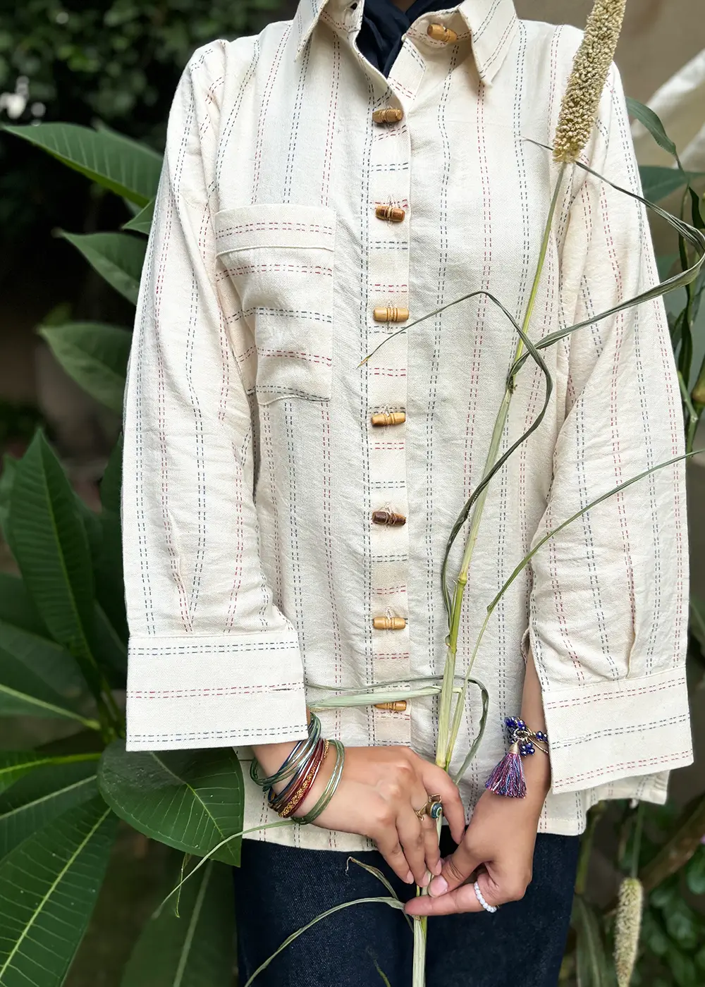 A versatile unisex shirt crafted from 100% pure cotton, handwoven on traditional pitlooms. Features natural indigo and alizarin-dyed stripes, finished with wooden buttons.